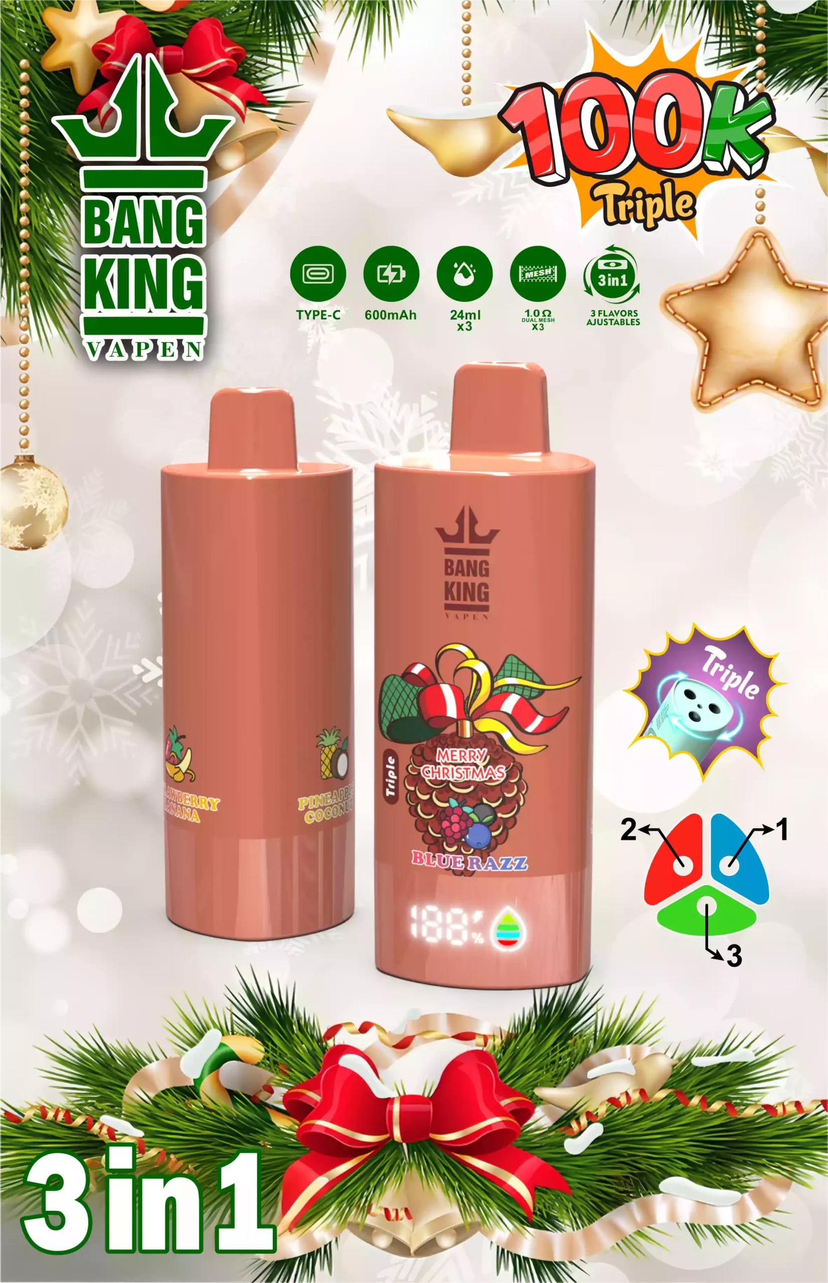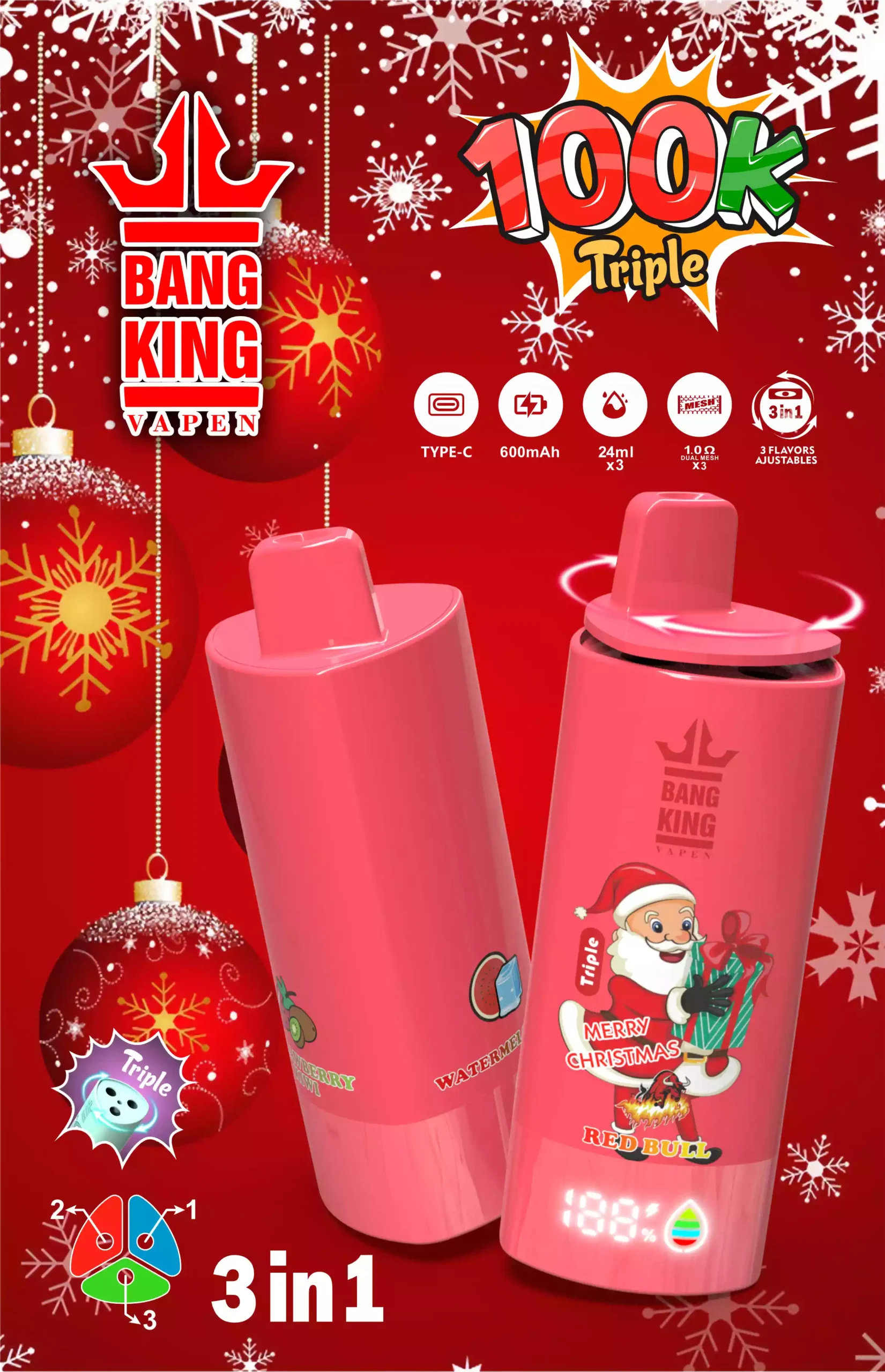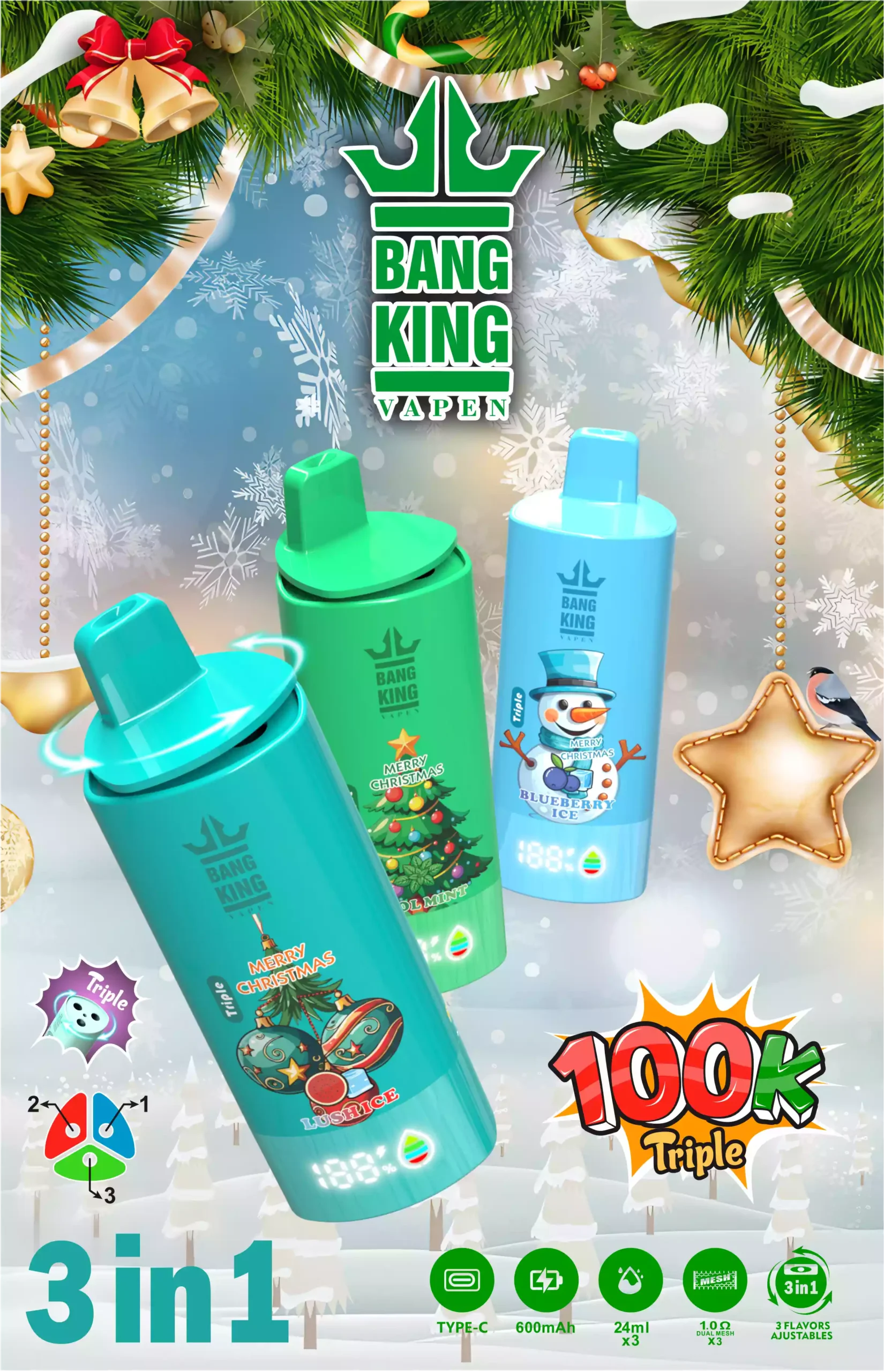 Bang Vapes Europese online winkel, dat een reeks wegwerpvapes biedt. Voor groothandelstip: koop tijdens de kerstpromotie Bang King 100k Puffs Vapes 30 dozen en ontvang 1 gratis, koop 60 dozen en ontvang 3 gratis, koop 100 dozen en krijg 5 gratis.