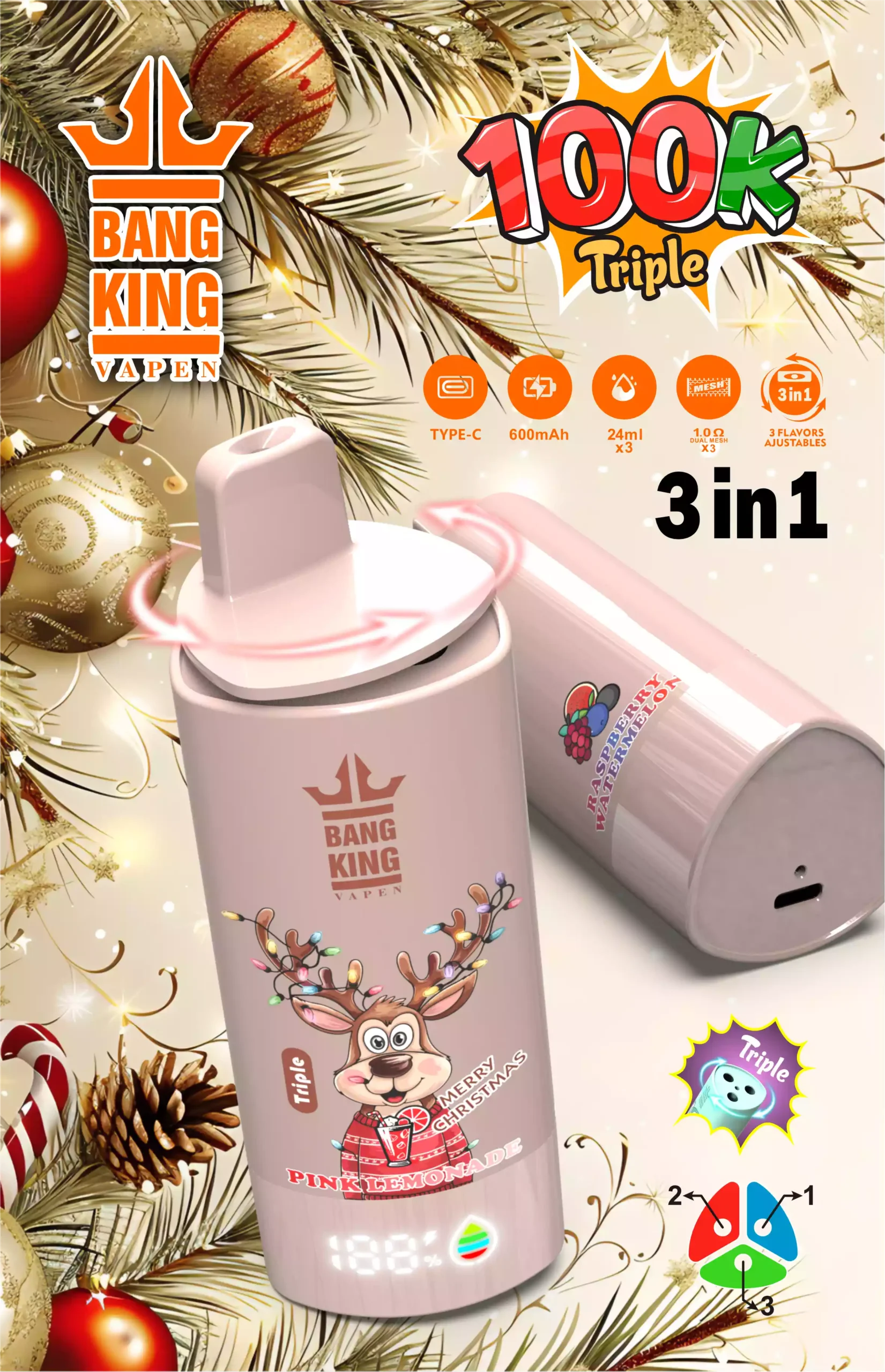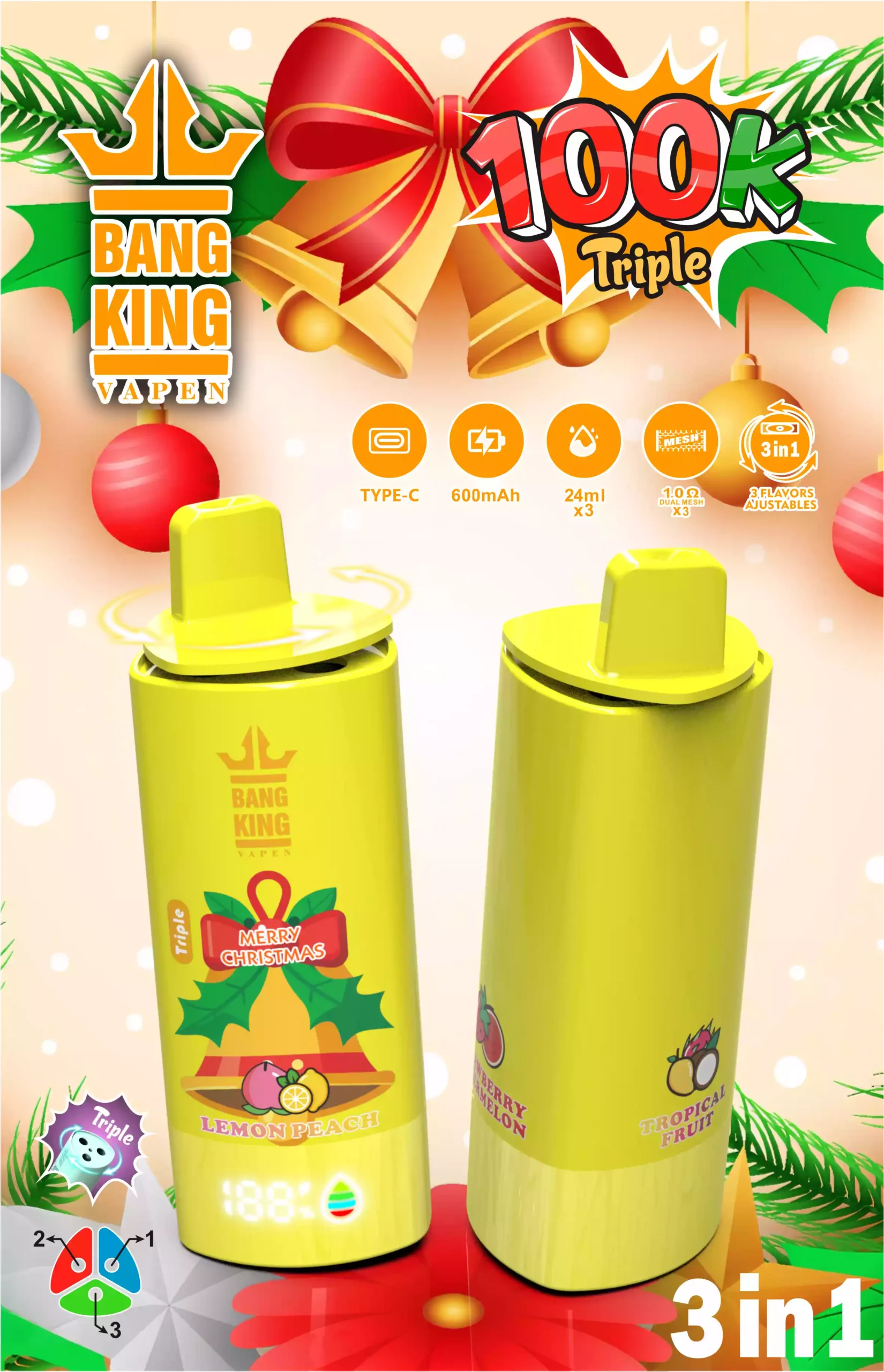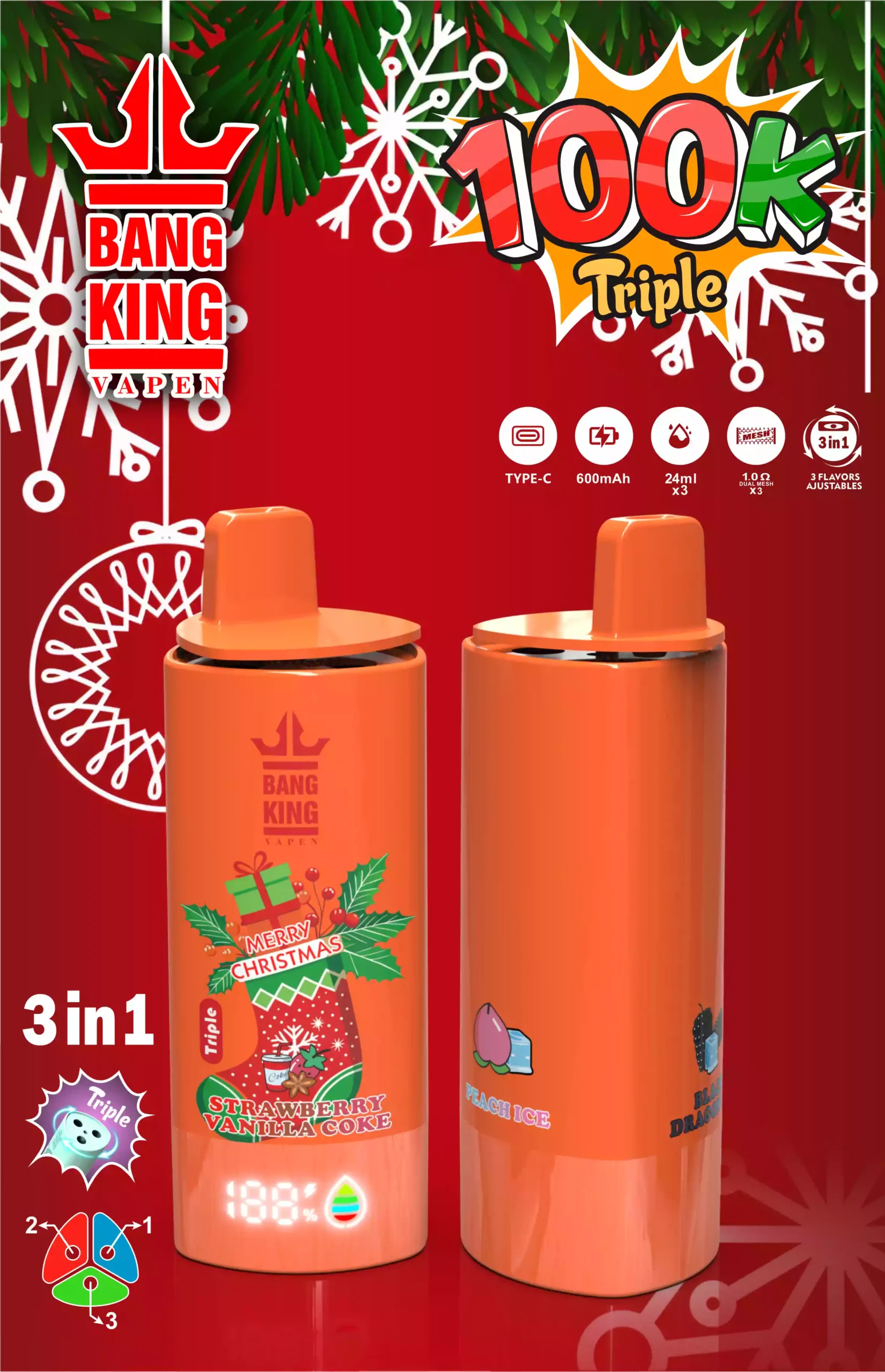 Bang Vapes Europese online winkel, dat een reeks wegwerpvapes biedt. Voor groothandelstip: koop tijdens de kerstpromotie Bang King 100k Puffs Vapes 30 dozen en ontvang 1 gratis, koop 60 dozen en ontvang 3 gratis, koop 100 dozen en krijg 5 gratis.