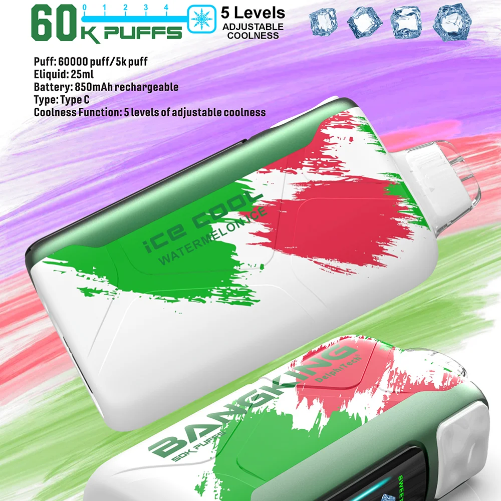 Bang King 60K Vape Ice Cool is een doorbraak voor rokers die kieskeurig zijn over hun koelingservaring. De meeste vapes hebben een vast “ijs” niveau, maar dit apparaat heeft 5 niveaus van instelbare koeling. Of je nu een milde verfrissende bries wilt of een hersenvries onder nul, je kunt het naar je voorkeur aanpassen.