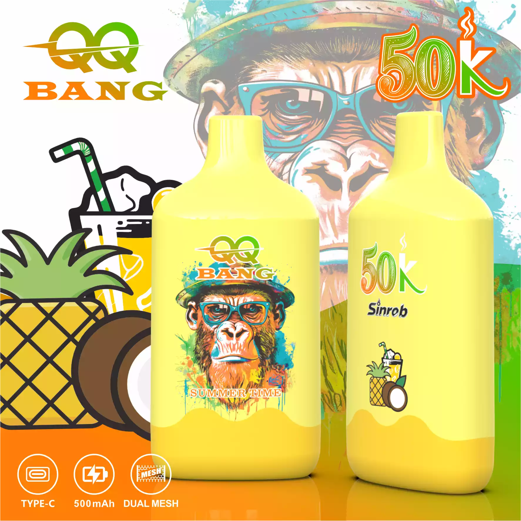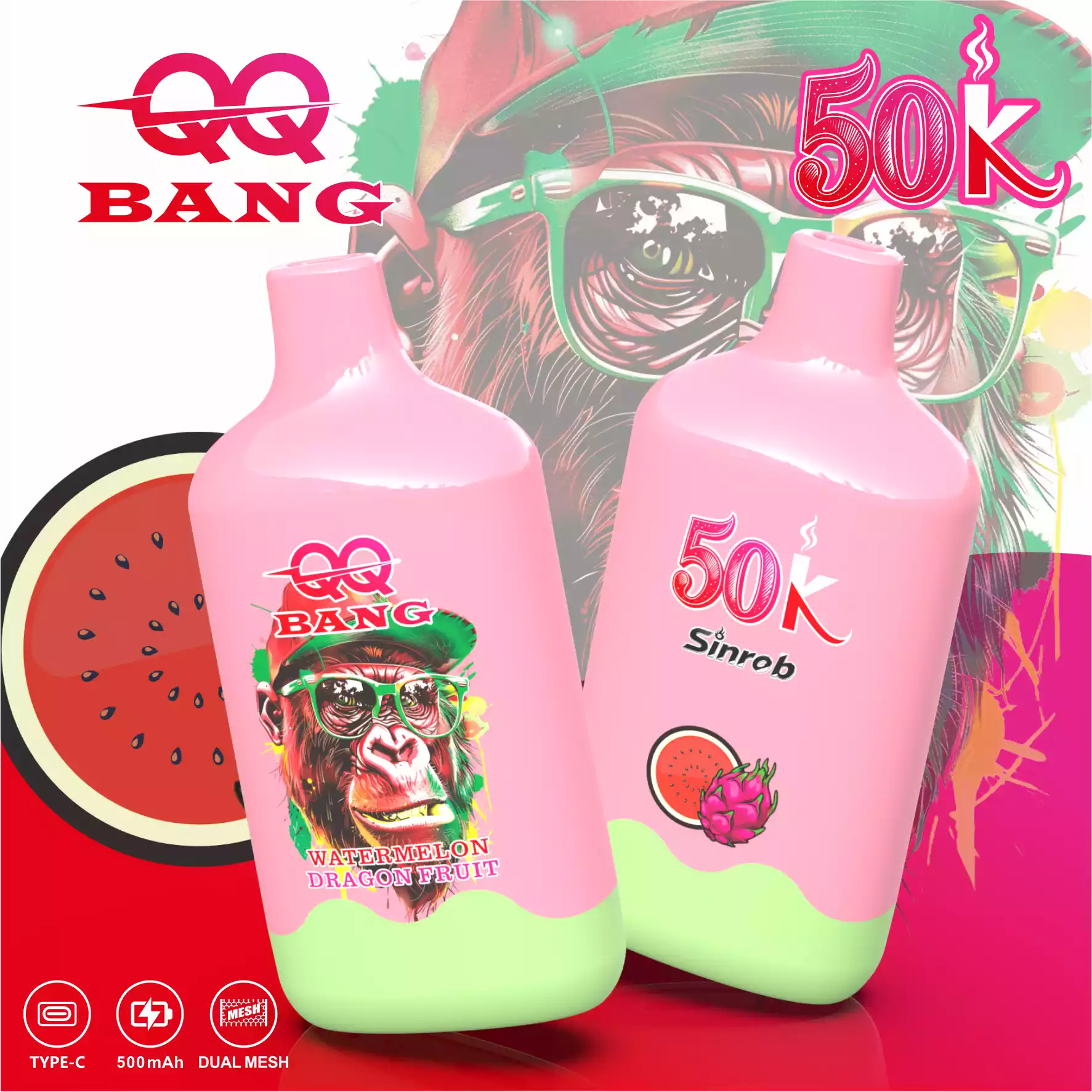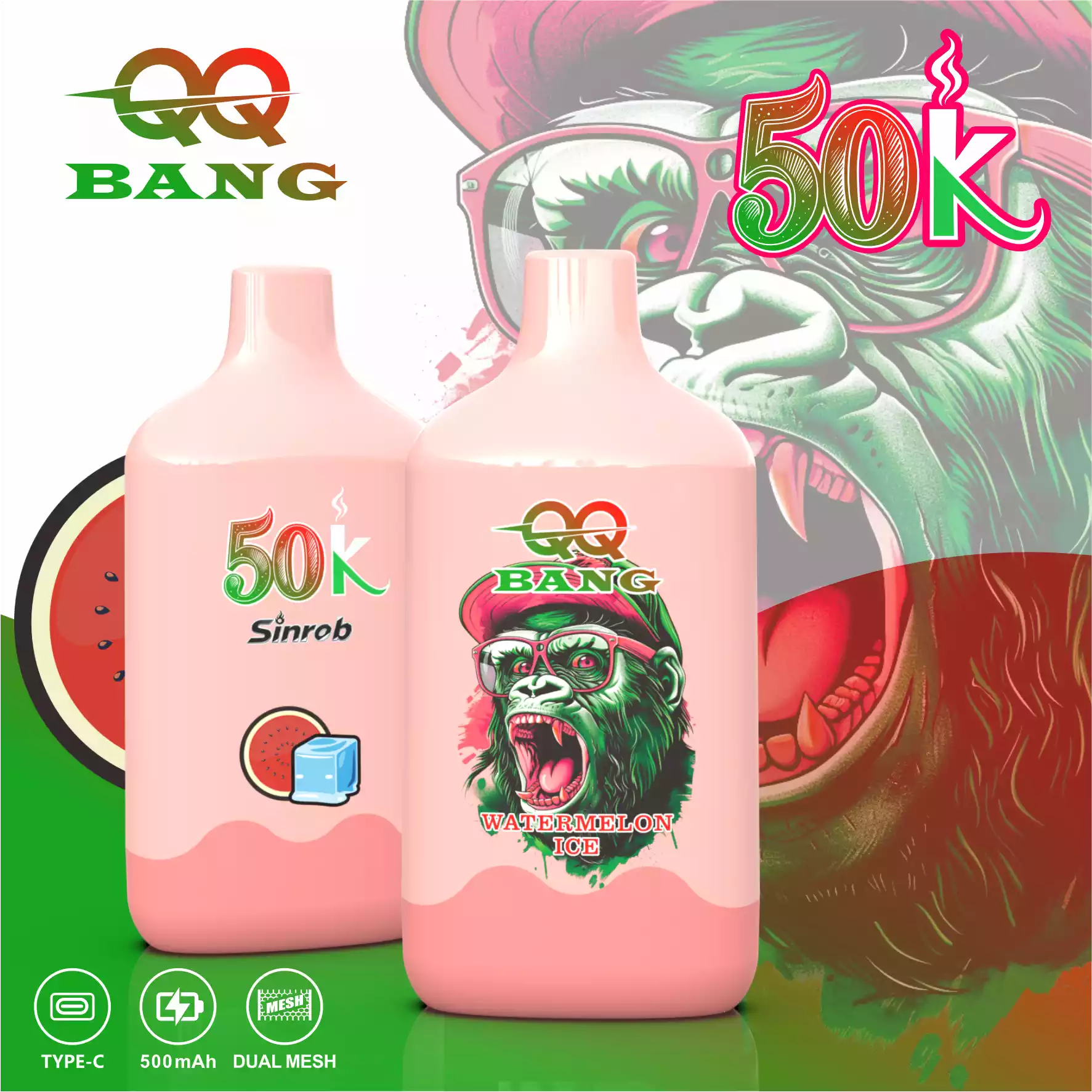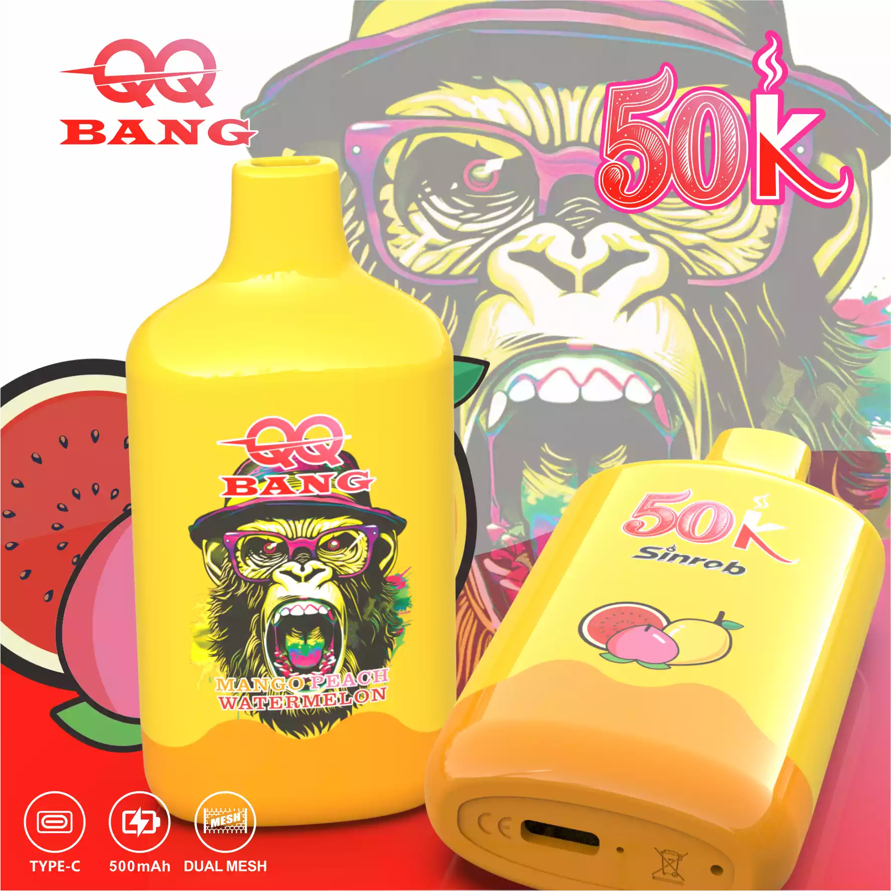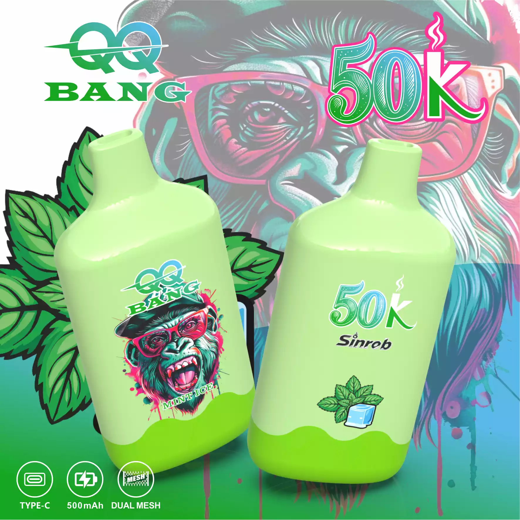 De QQ BANG 50000 Puffs is een hoogcapaciteits wegwerp vape met het populaire Aap Ontwerp. Het is voorgevuld met 40ml e-vloeistof en gebruikt een 1.2Ī© Mesh Coil voor grote wolken en rijke smaak.